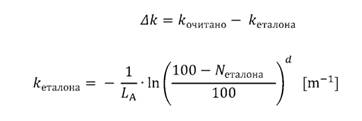 Ispitivanje greške merenja koeficijenta apsorpcije opacimetra - Δk određuje se poređenjem vrednosti koeficijenta apsorpcije koja se očitava sa opacimetra sa vrednošću koju reprodukuje etalonski filter opacitivnosti koja se može izračunati prema formuli: