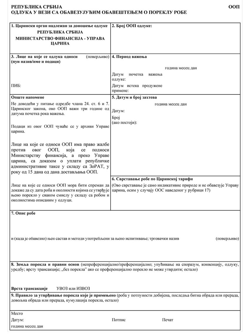 ZAHTEV ZA IZDAVANJE OBAVEZUJUĆEG OBAVEŠTENJA O SVRSTAVANJU ROBE (OOS)