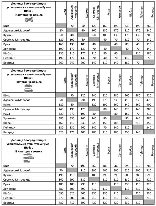 Iznose visine posebne naknade za upotrebu javnog puta, njegovog dela i putnog objekta (putarina) u zavisnosti od kategorije vozila i karakteristične deonice auto-puta za deonicu Beograd - Preševo - Dimitrovgrad sa ukrštanjem sa Moravskim koridorom za IA, I, II, III i IV kategoriju vozila, možete pogledati OVDE