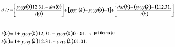 d/t - zbir (1) broja dana od datuma nultog perioda do 31. decembra te godine, kao dela broja dana u godini nultog perioda, (2) broja godina od godine novčanog toka koji se diskontuje do godine nultog perioda ali ne uključujući te dve godine i (3) broja dana od datuma početka novčanog toka koji se diskontuje, kao dela broja dana u godini tog novčanog toka do 31. decembra prethodne godine - izračunat primenom sledećih formula:
