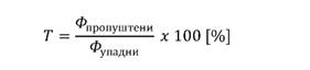 5) propustljivost T, predstavlja odnos između propuštenog i upadnog fluksa zračenja. Propustljivost se izražava u procentima, prema formuli: