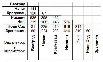 а) Хтори город од Беоґраду оддалєни 115 km?....................... б) Хтори два городи оддалєни 353 km?............................................... в) Хтори два городи оддалєни менєй од 50 km?.......................................... г) Кельо городи у табели од Беоґрада оддалєни вецей од 200 km?......... |