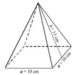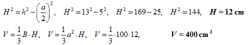 Вирахуй волумен правилней штиространей пирамиди кед рубец основи a = 10 cm, а висина бочней страни h = 13 cm. Волумен пирамиди ________ cm3. |