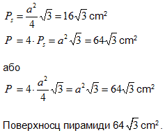 Основни рубец правилней тространей єднакорубцовей пирамиди 8 cm. Яка єй поверхносц?